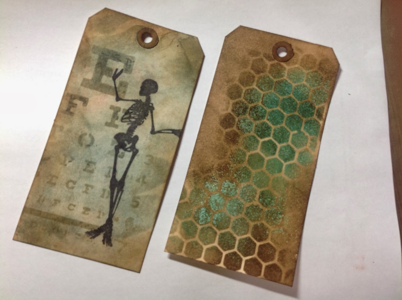 I am only 4 techniques in and still working on day 1...wow!! Amazing techniques. Here is the first tag....Very cool! Love the distress paints! Thanks Tim!